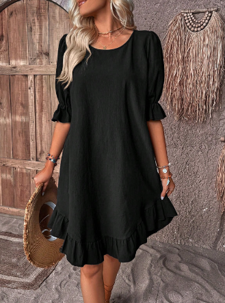Abito smock solido con maniche a sbuffo e orlo increspato