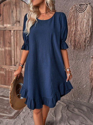 Abito smock tinta unita con maniche a sbuffo e orlo arricciato