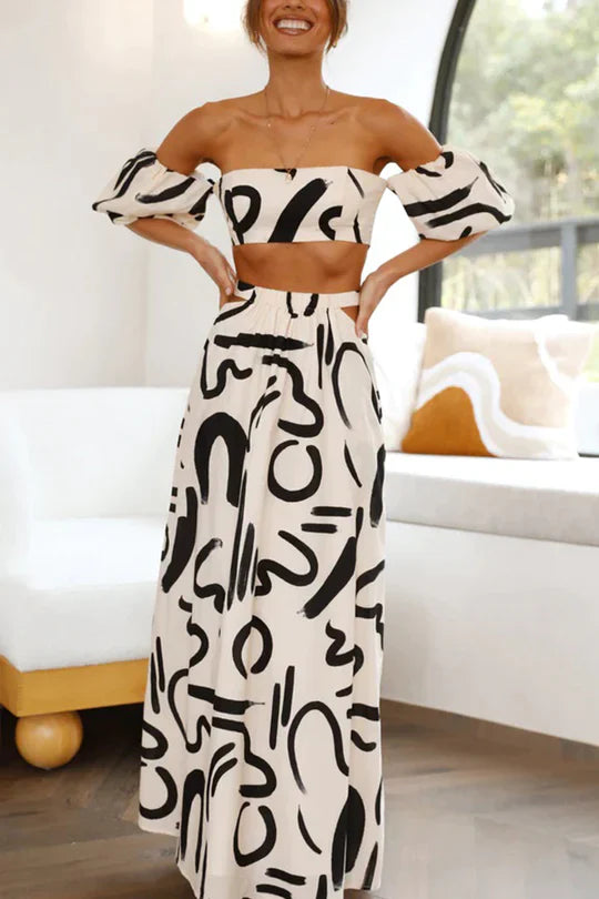 Allegra Doodle - Set top off shoulder stampato e maxi gonna con ritagli tascabili