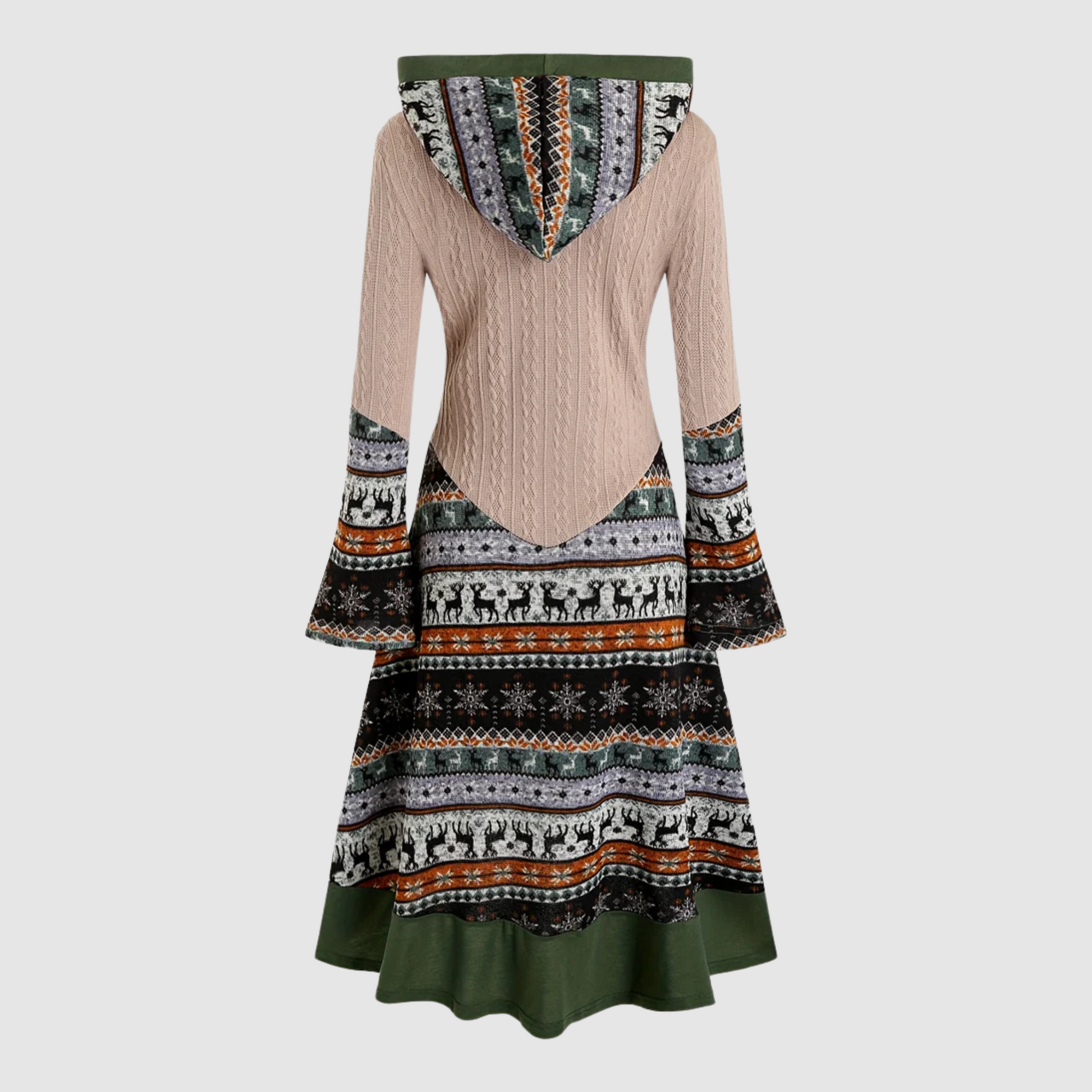 Festeggiate le feste con stile con questo abito natalizio da donna, caratterizzato da un adorabile motivo tribale con alci e fiocchi di neve. Il tessuto a maglia è morbido e accogliente, perfetto per tenersi al caldo durante le feste invernali. Con un lusinghiero orlo alto-basso, questo abito offre un tocco moderno al classico stile natalizio. Il design con cappuccio e l'abbottonatura sul davanti creano un look comodo e casual, mentre la morbida fodera offre calore e comfort extra nelle giornate fredde. Ideale per le feste, le riunioni di famiglia o le serate in compagnia davanti al camino, questo abito dona allegria e un tocco di eleganza.