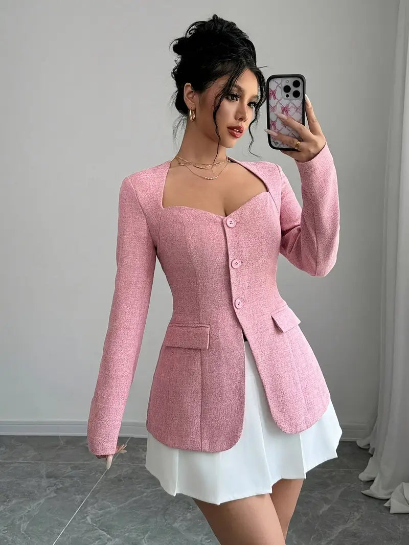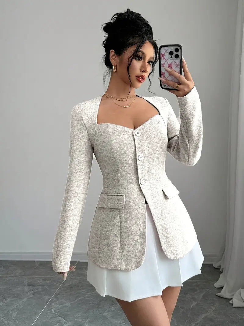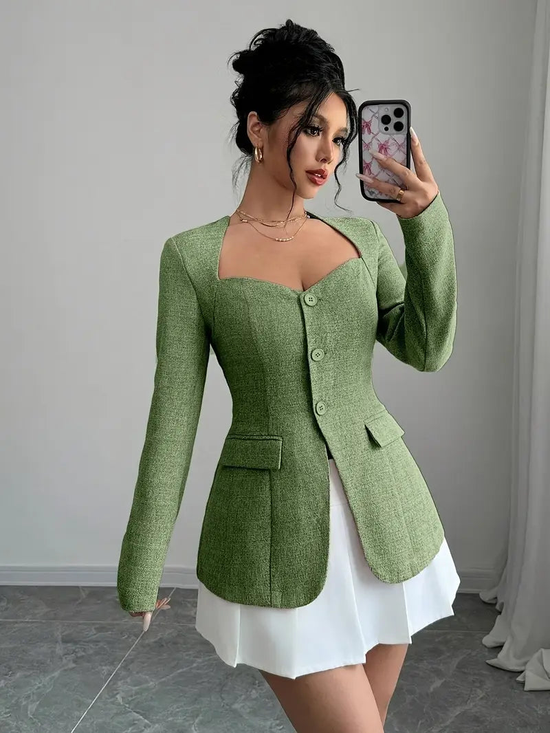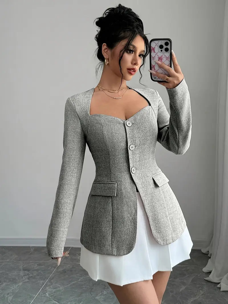 Aggiungi un tocco di raffinatezza al tuo guardaroba con l'elegante giacca a maniche lunghe con volant. Realizzata in morbido tessuto di alta qualità, questa giacca ha una vestibilità sartoriale lusinghiera e delicati dettagli a volant sui bordi, creando una silhouette chic e femminile. Le maniche lunghe e il colletto classico offrono un look elegante e senza tempo, mentre la chiusura con bottoni assicura una vestibilità sicura. Perfetta per occasioni casual e formali, questa giacca è un'aggiunta versatile a qualsiasi outfit.