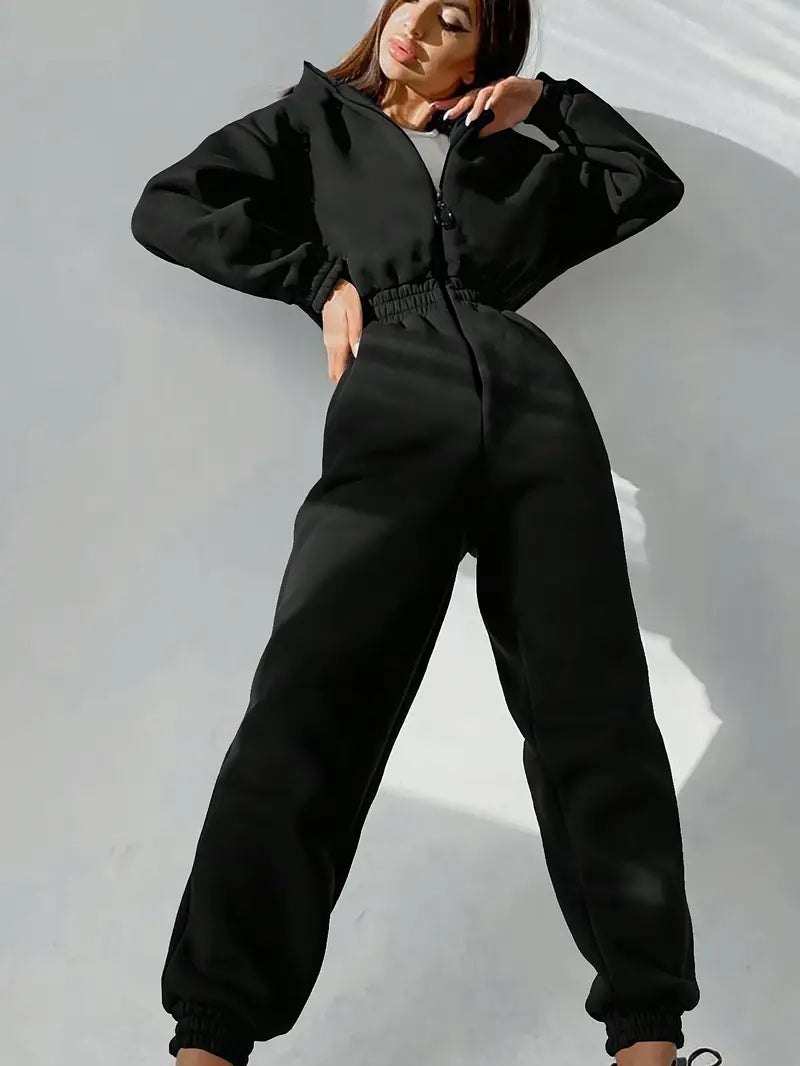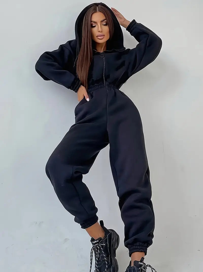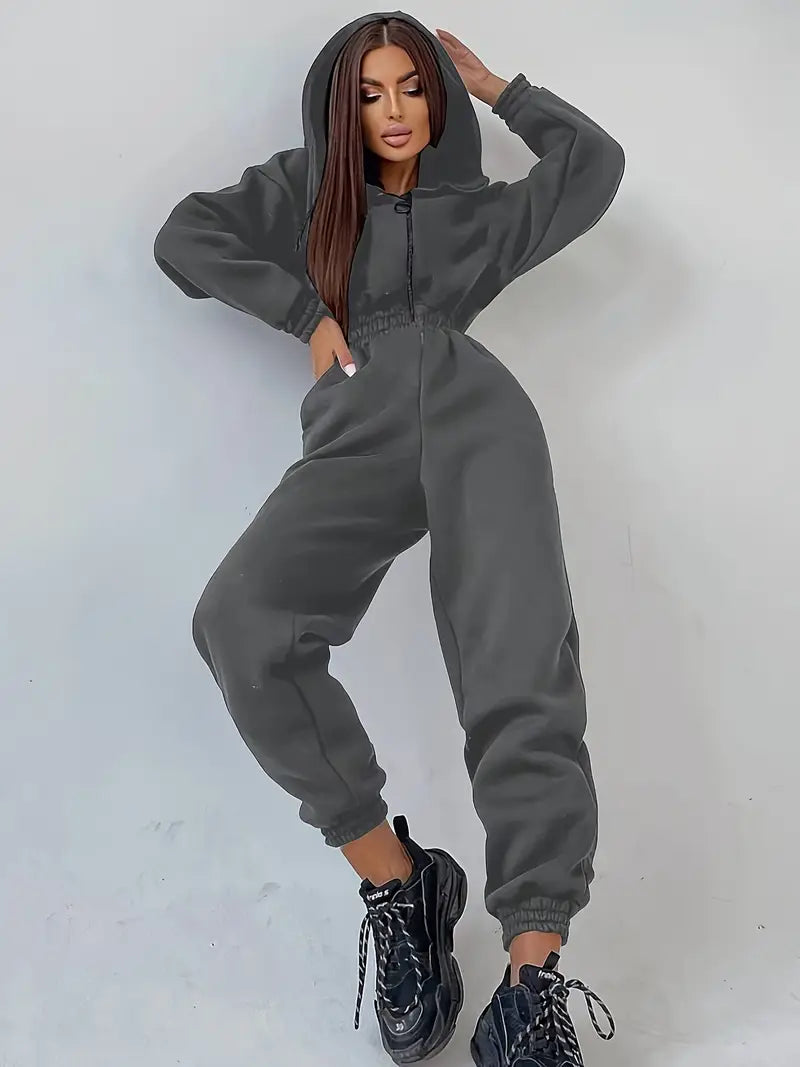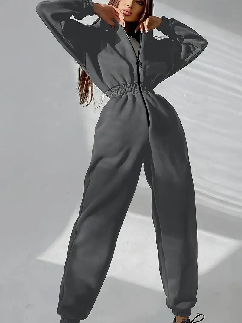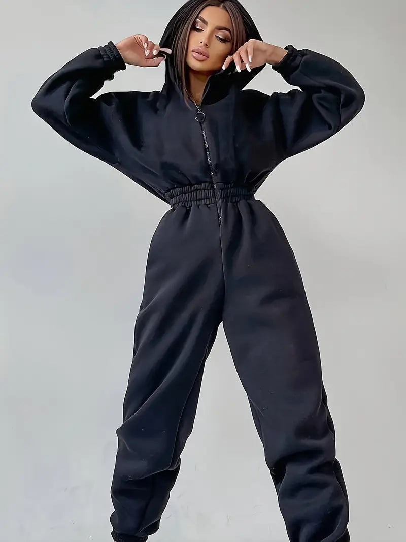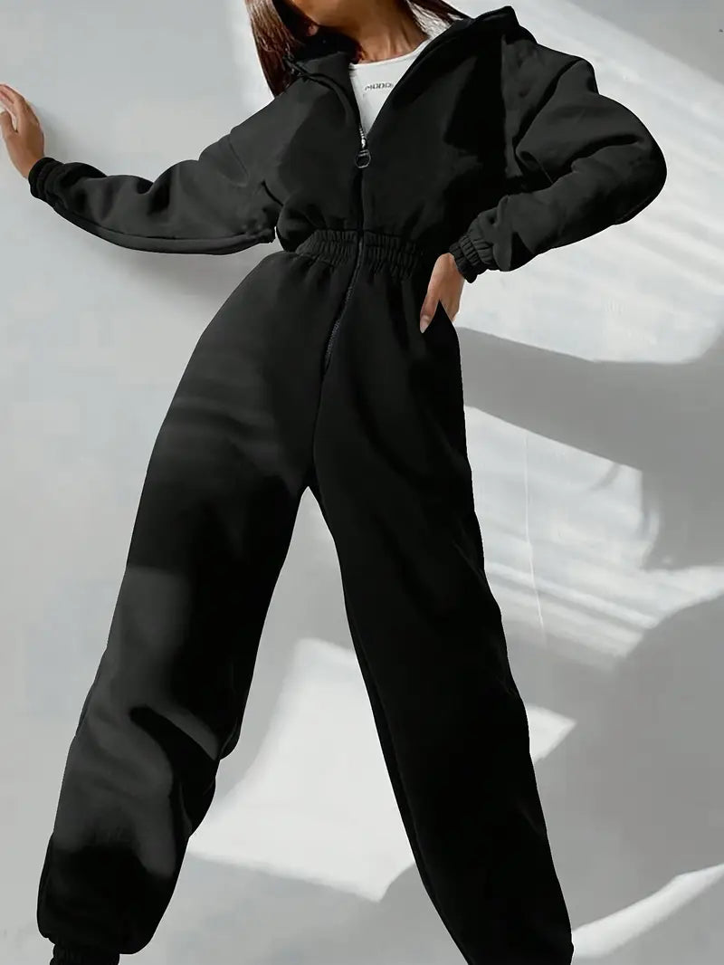 La tuta con cappuccio in vita elasticizzata è la combinazione perfetta di comfort e stile casual per farti sentire rilassata ma alla moda. Realizzata in tessuto morbido ed elastico, la tuta presenta una cintura elastica regolabile che migliora la vestibilità e consente un look personalizzato e lusinghiero. Il cappuccio attaccato e le maniche lunghe forniscono calore e intimità extra, mentre la chiusura lampo anteriore aggiunge un tocco pratico. Ideale per rilassarsi, fare commissioni o uscite informali, questa tuta unisce senza sforzo stile e comfort.
