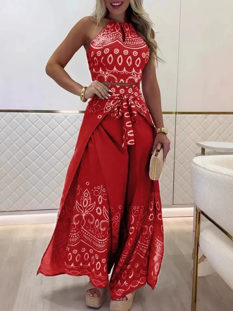 Vuoi un completo audace che attiri tutti gli sguardi con eleganza? Questo set con crop top stampato a collo halter e schiena scoperta, abbinato a pantaloni a gamba larga, è l’equilibrio ideale tra grinta e raffinatezza. Con la sua stampa vivace e il design valorizzante, è perfetto per occasioni informali o festive. L’ideale per godersi l’estate con stile e sicurezza.