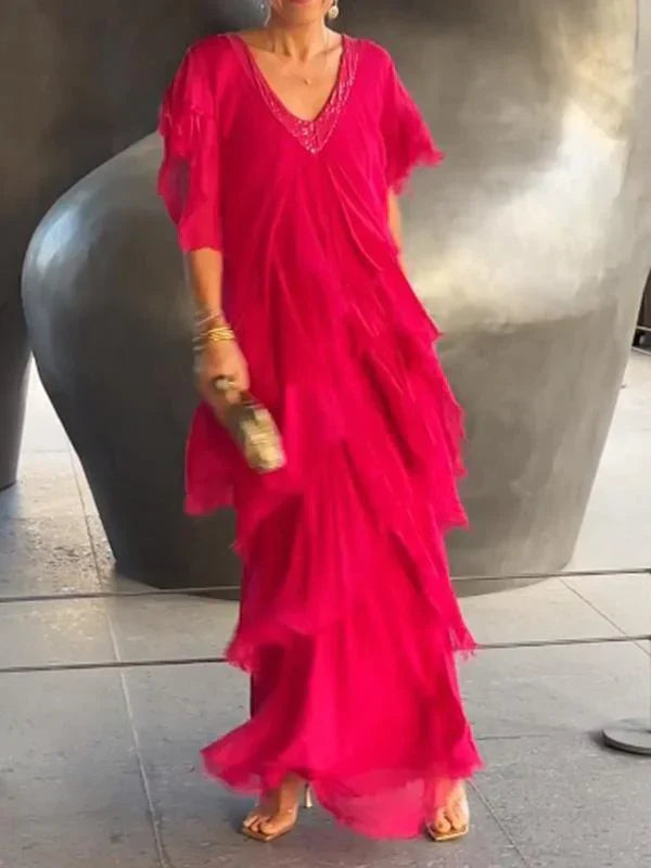Questo abito è pura eleganza. La sua silhouette lunga e fluida e lo scollo a V lusinghiero lo rendono perfetto per le occasioni speciali. La gonna a torta aggiunge un tocco di drammaticità e femminilità. Ti sentirai sicura e bella con questo abito. Disponibile in varie taglie e colori per adattarsi al tuo stile