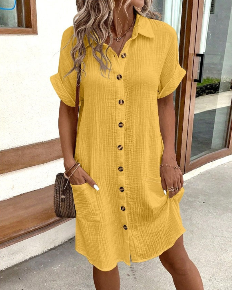 Confezionato con tessuto traspirante di alta qualità, questo vestito offre una sensazione morbida e confortevole, senza perdere la sua silhouette strutturata e elegante. Le sue delicate maniche corte e il design con bottoni aggiungono un tocco di sofisticazione, rendendolo un básico versatile in ogni guardaroba. Che tu lo indossi con tacchi o scarpe basse, questo vestito garantisce un look chic e stilizzato durante tutto il giorno.