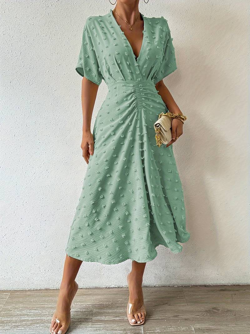 Cerchi un abito che unisca fascino romantico ed eleganza moderna? L’abito con volant e texture svizzera è la scelta ideale. Con il suo delicato motivo a pois, volant eleganti e siluetta fluida, offre uno stile femminile e senza tempo per ogni occasione. Perfetto per un brunch, un appuntamento galante o un evento estivo, ti farà sentire elegante e sicura senza sforzo.