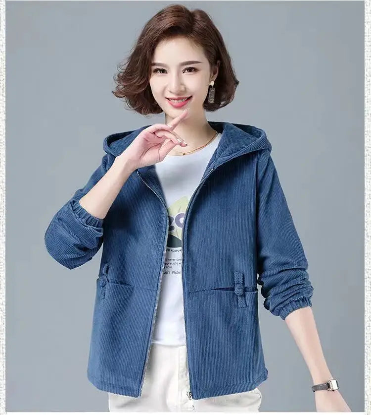 Un capo indispensabile per il tuo guardaroba autunnale e invernale, la giacca con cappuccio in velluto a coste da donna ti terrà comoda ed elegante. Combinando consistenza e comfort, questa giacca è realizzata in morbido e resistente tessuto di velluto a coste, offrendo calore senza compromettere lo stile. Il cappuccio attaccato fornisce una protezione extra dagli elementi, mentre la chiusura con zip frontale consente uno stile versatile. Con la sua vestibilità ampia e le comode tasche laterali, questa giacca è perfetta da indossare sopra abiti casual o da abbinare ad abiti per un look chic e rilassato.