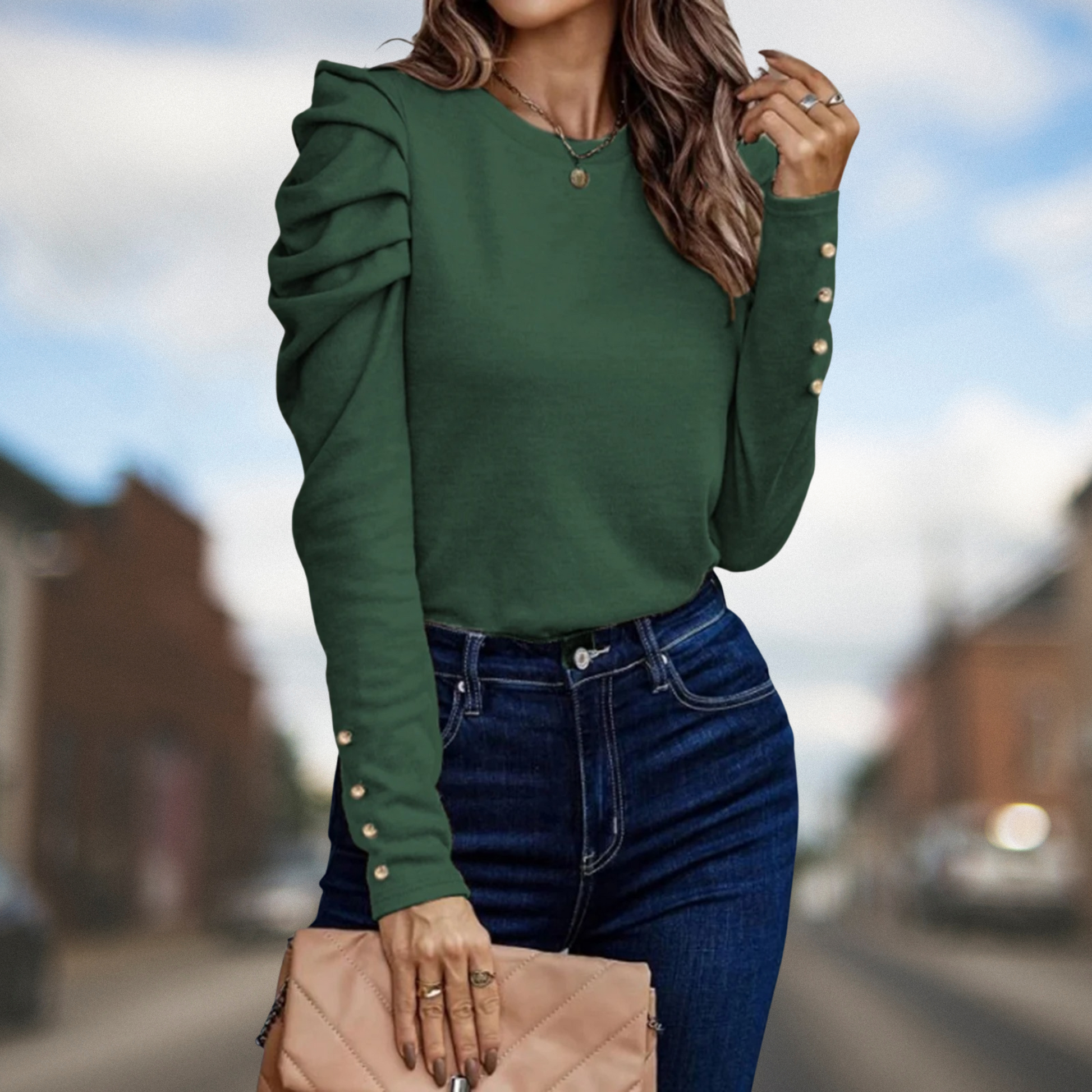 Aggiornate il vostro guardaroba con il nostro top a girocollo con maniche a sbuffo, un mix perfetto di stile chic e comfort. Questo capo versatile presenta un classico girocollo e voluminose maniche a sbuffo che aggiungono un tocco di femminilità a qualsiasi outfit. Realizzato in tessuto morbido e traspirante, si drappeggia magnificamente su tutti i tipi di corpo consentendo libertà di movimento. La vestibilità rilassata lo rende perfetto sia per le uscite casual che per le occasioni più eleganti, assicurandovi un look elegante e senza sforzo ovunque andiate.