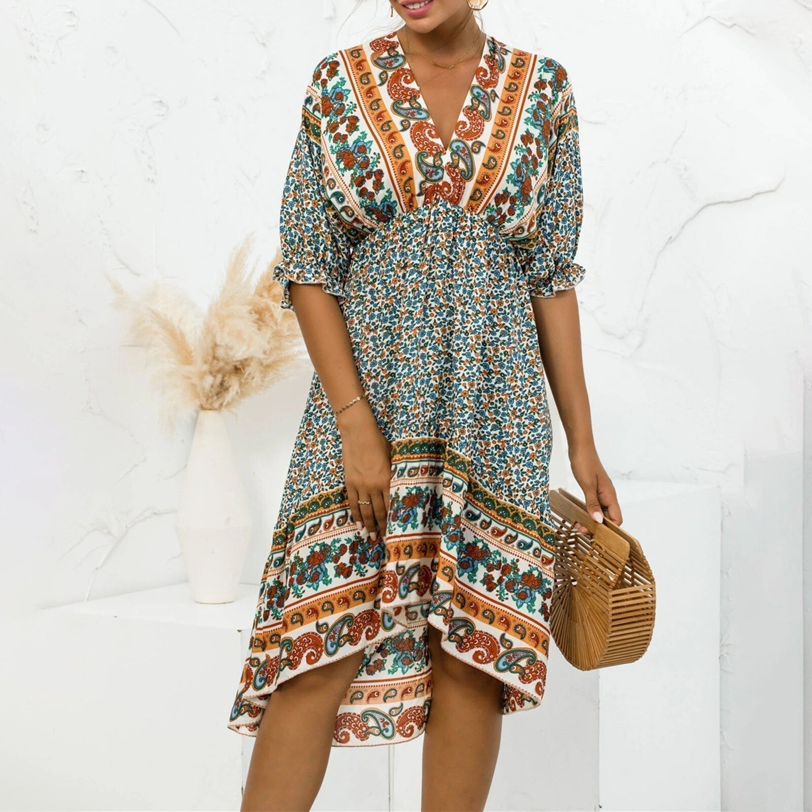 Cerchi un abito che unisca eleganza e comodità? Questo Abito Midi Floreale con Profondo Scollo a V e Maniche a Metà è il perfetto equilibrio tra grazia e fascino. Con un scollo profondo accattivante, maniche fluide e una splendida fantasia floreale, questo abito valorizza la tua figura offrendoti una sensazione leggera e fresca. Perfetto per una cena romantica, una festa in giardino o un'uscita informale, ti farà apparire impeccabile senza sforzo!