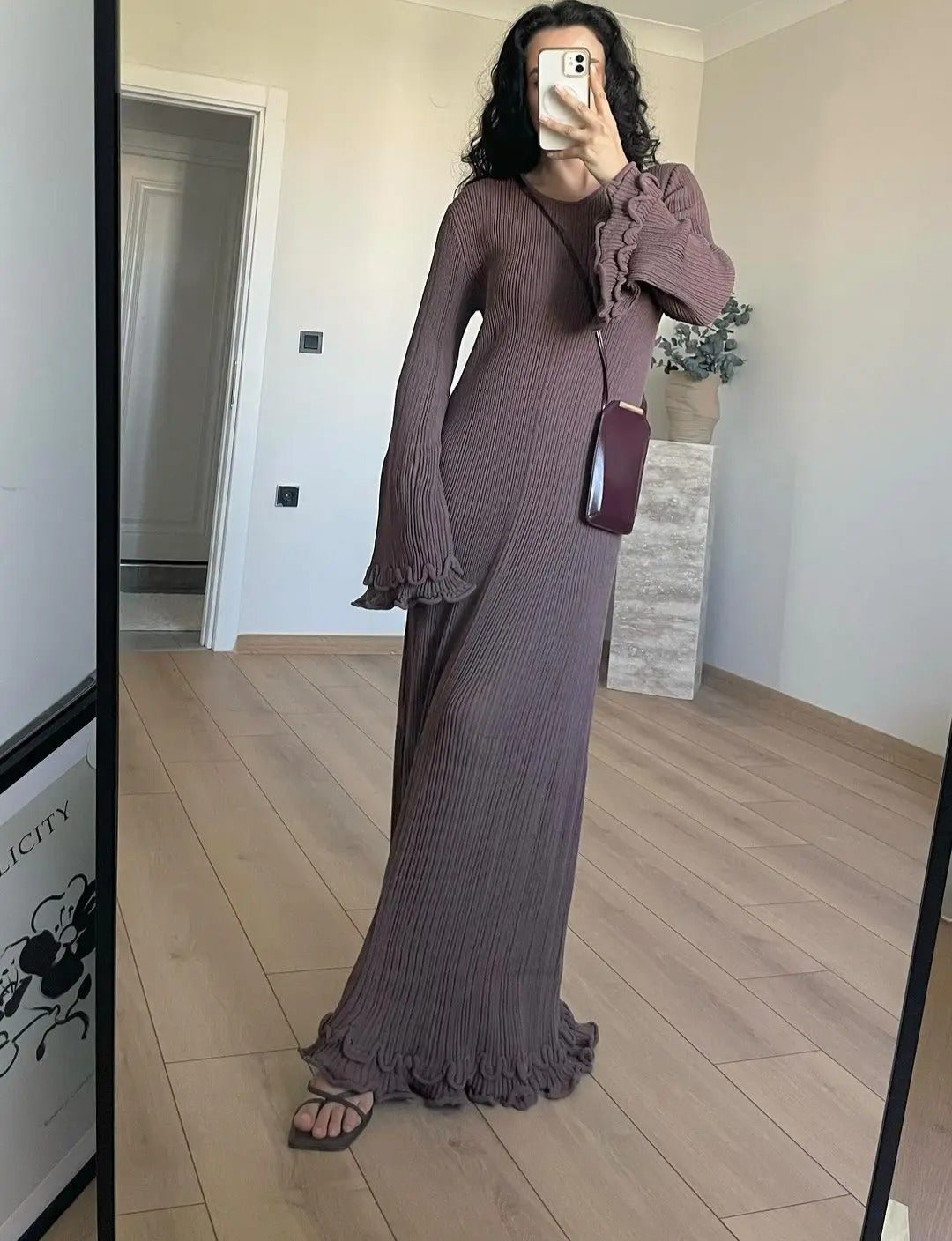 Goditi un'eleganza senza sforzo con i nostri maxi abiti in maglia con volant che offrono stile e comfort per ogni occasione. Realizzati in un morbido tessuto elasticizzato in maglia, questi abiti hanno una silhouette lusinghiera che cade magnificamente e accentua la tua figura. I dettagli con volant aggiungono un tocco giocoso, rendendo questo abito perfetto per tutto, dalle uscite casual alle occasioni speciali.